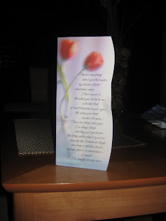 So…last night when we got home from work my husband had placed a card for me by the tv. Apparently, being the blind person I am (note from previous post-I can’t read) I did not see it. I think he was waiting and hoping I was going to see it without him having to tell me, but ofcourse, I ruined that for him. Finally at about 8:30 pm he said “Sweetie, look…” I finally looked and saw the card sitting on the tv (it’s about time since it had probably been sitting there all night right?). When I opened it and read it, and yes it was SUPER sweet, I can’t lie…I thought to myself…’hmmm, what does he want from me?’ I have to admit that it’s terrible that popped in my head, but again, I am always thinking people want something from me. To my surprise, he DIDN’T want anything in return. He was just being SWEET! It’s rare that a man knows how to be sweet just because…but I can admit…MY HUSBAND’S GOT IT DOWN! I feel lucky to have such a wonderful man in my life! I only hope he will continue to do such nice little things for me for years to come.